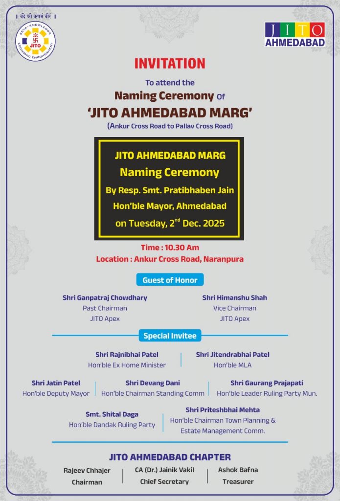 Dear Members, It’s indeed a landmark day for JITO. The naming of the road as JITO Ahmedabad Marg is a proud endorsement of our community’s strength and significance. Join us for this historic moment. We look forward to your esteemed presence on Tuesday, 2nd November, 10:30 AM at Ankur Cross