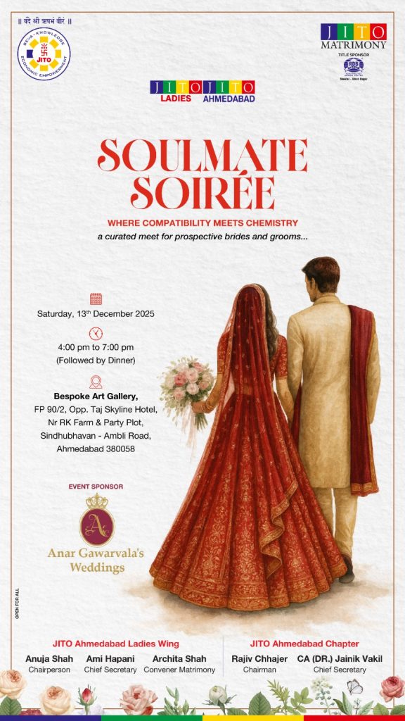 ✨Soulmate Soirée An exclusive event curated by JITO Ladies Wing Under the inspiring leadership of Chairperson Anuja Shah and Chief Secretary Ami Hapani The Soulmate Soirée is a thoughtfully designed gathering where young men and women from esteemed Jain families come together in a warm, elegant, and comfortable setting. This