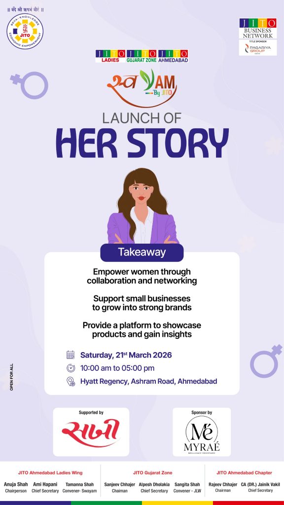 Invitation to All JLW Core Committee,Project Committee & Members JLW Ahmedabad is delighted to invite you for the Launch of “Her Story” under Swayam – B2B, an initiative that celebrates the entrepreneurial journey of our JLW members. Through this platform, diverse member brands will be professionally videographed and showcased across