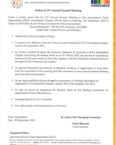 Notice is hereby given that the 15th Annual General Meeting of Jain International Trade Organisation (JITO), Ahmedabad Chapter will be held on Saturday, 30th September, 2023 at 5.30pm at JITO Office & also Online to transact the following business: