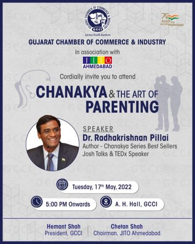 Gujarat Chamber of Commerce & Industry in association with JITO Ahmedabad invites you to attend the Chanakya & the art of parenting by Dr. Radhakrishnan Pillai (Author – Chanakya Series Best sellers, JOSH talks and TEDX Speaker.