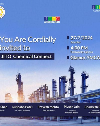 આપણે જીતો કેમિકલ કનેક્ટ માં ખાસ મળીશું. આપની કંપનીના વીઝીટીંગ કાર્ડ સાથે અવશ્ય લાવશો. આપણે બિઝનેસ નેટવર્કિંગ કરીશું તથા જીતો બિઝનેસ બજારની મુલાકાત લઈશું.
