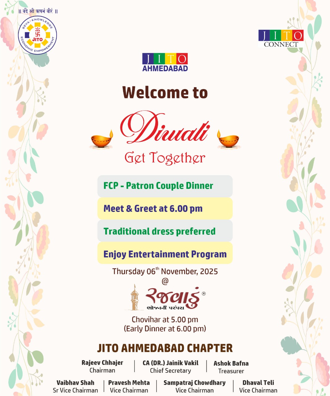 JITO Ahmedabad is organizing a Diwali Sneh Milan (Get-Together) for FCP and Patron Members on Thursday, November 6th, at Rajwadu. You are cordially invited with your spouse to join us. Let’s celebrate the new year together!