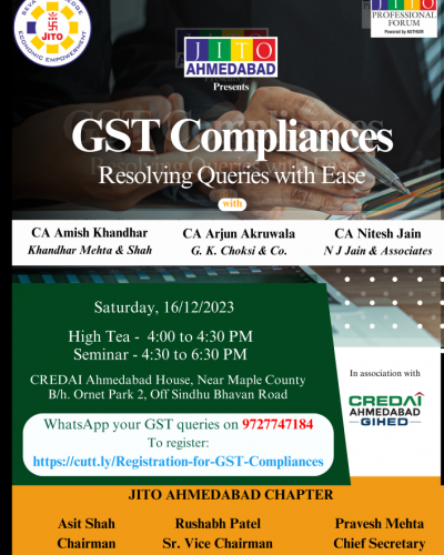 GST કર માળખાને લગતા વિવિધ પ્રશ્નોના નિરાકરણ માટે જીતો અમદાવાદ અને CREDAI AHMEDABAD GIHED સાથે મળીને 16મી ડિસેમ્બર 2023 શનિવારના રોજ સાંજે 4.30 થી 6.30 વાગ્યા સુધી સેમિનાર નુ આયોજન કરેલ છે. જેમાં આપ અને આપના પ્રતિનિધિ ને ભાગ લેવો હોય તો રજીસ્ટ્રેશન કરો અને આપના GST બાબતે પ્રશ્નો 9727747184 પર મોકલી આપો.