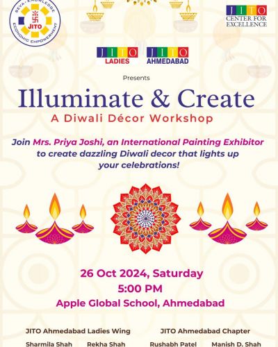 JITO अहमदाबाद लेडीज विंग और JITO सेंटर फॉर एक्सीलेंस के सहयोग से, हम आपके लिए “इल्युमिनेट एंड क्रिएट” नामक एक विशेष दीवाली डेकोर कार्यशाला प्रस्तुत कर रहे हैं। 26 अक्टूबर 2024, शनिवार को शाम 5:00 बजे एप्पल ग्लोबल स्कूल, अहमदाबाद में हमारे साथ जुड़ें और रचनात्मकता और उत्सव का आनंद उठाएं।