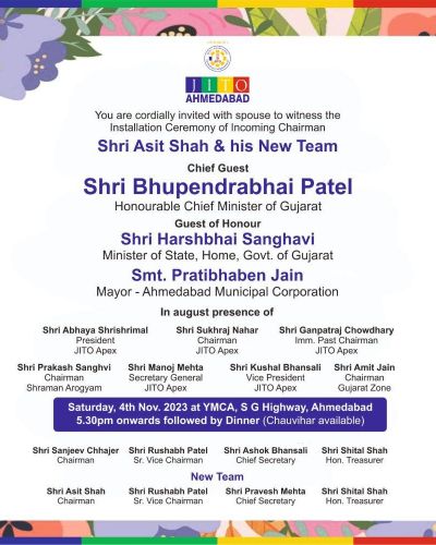We extend a warm invitation to join us for the Oath Ceremony of JITO Ahmedabad Office Bearers, Ladies Wing & Youth Wing for the year 2023-24. We are honored to have presence of our esteemed chief guests Shri Bhupendra Patel, Chief Minister of Gujarat and Shri Harsh Sanghvi, Home Minister of Gujarat and Smt. Pratibhaben Jain, Mayor, AMC.