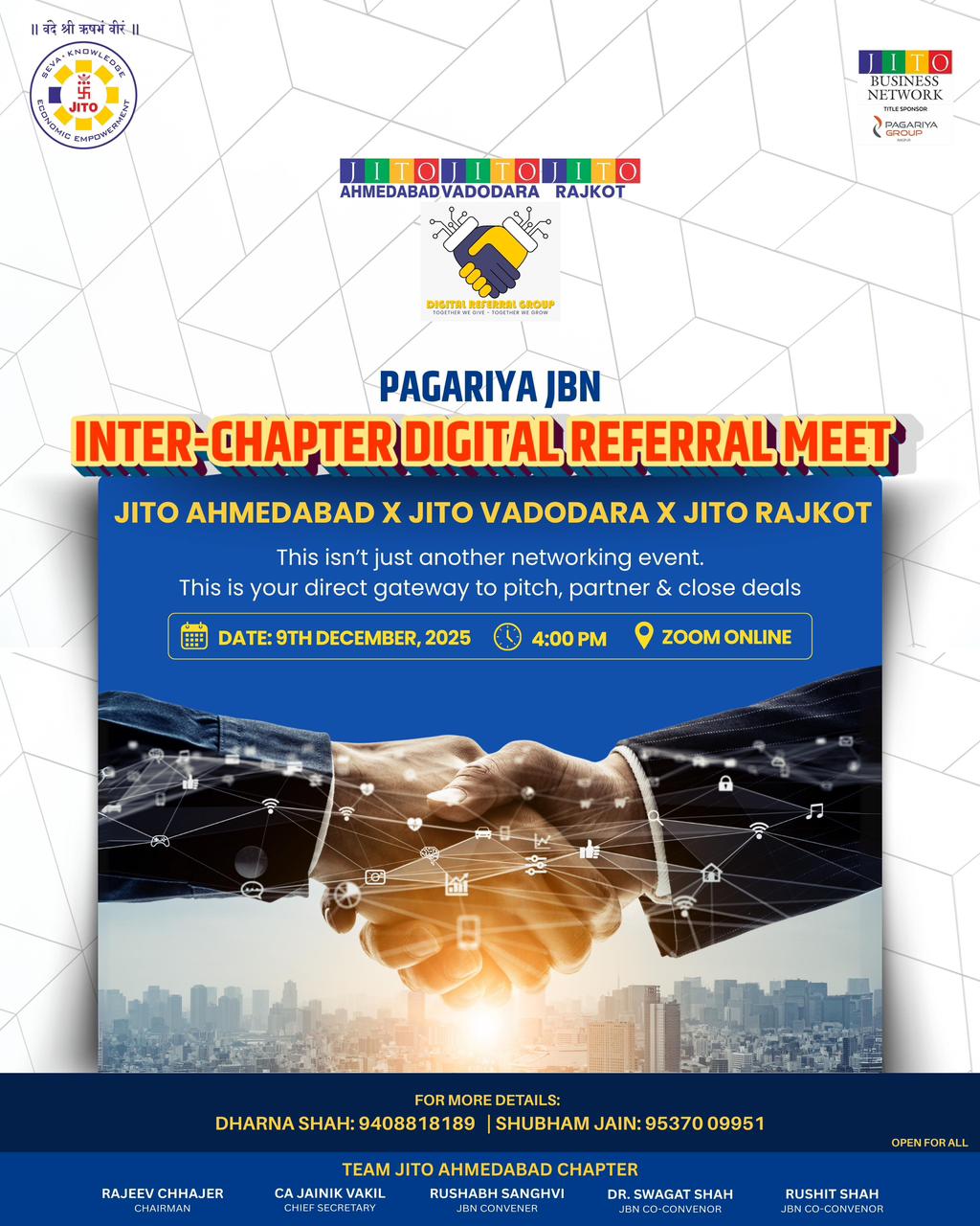 We are delighted to invite you to an impactful Digital Referral Group Meet designed to strengthen interchapter collaboration and empower business growth across cities of Gujarat.