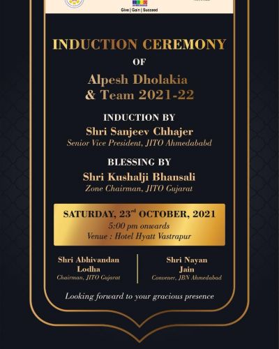 Induction Ceremony of Shri Alpesh Dholakia by JITO Ahmedabad Sr. Vice Chairman Shri Sanjeev Chhajer and blessings by Zone Chairman Shri Kushal Bhansali ji on 23rd Oct. 2021 at hotel Hyatt, Vastrapur.