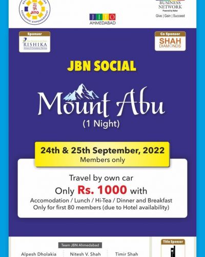 JBN !! We are all in this Together 🤟💐 ☆Venue : Mt. ABU ☆Date : 24th & 25th September (one night) ☆Fees : Only Rs 1000 per person (subsidised). ☆Self Drive by your car or car pool at memers cost. ☆ Inclusions of Lunch- hitea – dinner – breakfast ☆Members Only ☆Limited to 1st 80 Members Registered. Let us Join Together and celebrate JBN Social in a casual Mode. Register Now. https://forms.gle/HiyPR5P1PzJ6WuAm6