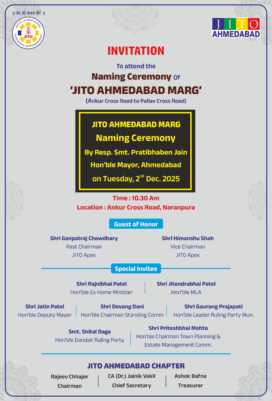 It’s indeed a landmark day for JITO. The naming of the road as JITO Ahmedabad Marg is a proud endorsement of our community’s strength and significance.