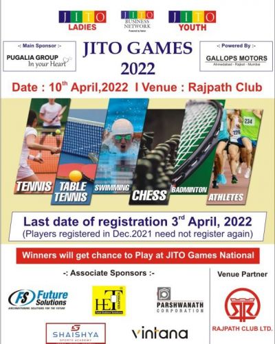 JITO Ahmedabad Games 2022 is held at Rajpath Club on 10th April 2022. Please inform all Jains. Registration closes on 3rd April 2022. Online registration link – https://cutt.ly/JITO-Ahmedabad-Games-2022