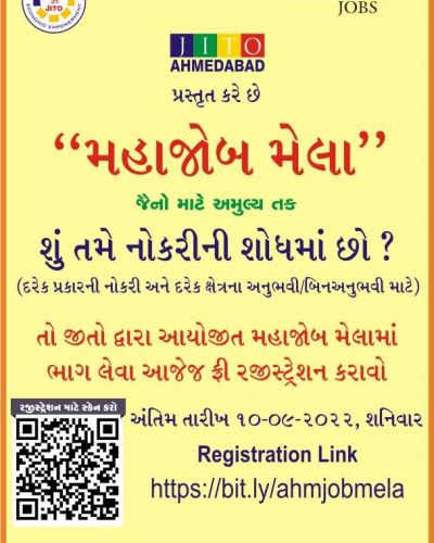 જીતો દ્વારા નૌકરી મેળવવા ઇચ્છુક જૈનો માટે મહા જોબમેલા નું આયોજન કરવામાં આવેલ છે તો આપ સૌને વિનંતી છે કે આપના જૈન મિત્રો અને ફેમિલી ગ્રુપ માં આ મેસેજ ફોરવર્ડ કરવા વિનંતી છે જેથી વધુ ને વધુ જૈનો લાભ લઈ શકે. Registration link – http://bit.ly/ahmjobmela