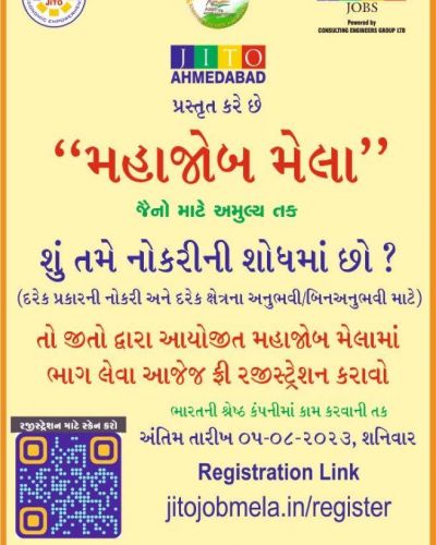 જીતો દ્વારા નૌકરી મેળવવા ઇચ્છુક જૈનો માટે મહા જોબમેલા નું આયોજન કરવામાં આવેલ છે તો આપ સૌને વિનંતી છે કે આપના જૈન મિત્રો અને ફેમિલી ગ્રુપ માં આ મેસેજ ફોરવર્ડ કરવા વિનંતી છે જેથી વધુ ને વધુ જૈનો લાભ લઈ શકે. રજીસ્ટ્રેશન લીંક: http://jitojobmela.in/register