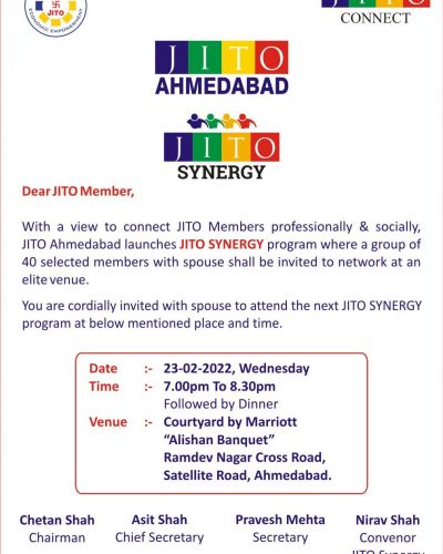 JITO Synergy is an initiative by JITO Ahmedabad under the mission of Economic empowerment where a group of 40-60 JITO members with spouse are invited to network at an elite venue and talk about their professional activities.