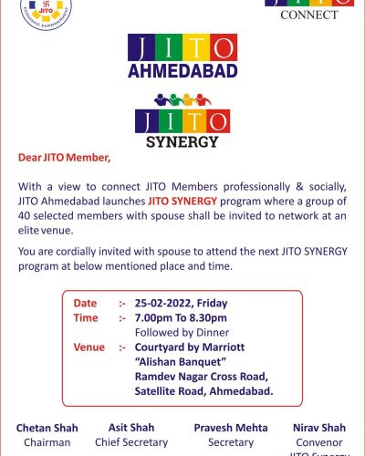 JITO Synergy is an initiative by JITO Ahmedabad under the mission of Economic empowerment where a group of 40-60 JITO members with spouse are invited to network at an elite venue and talk about their professional activities.