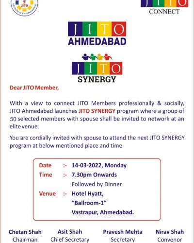JITO Synergy is an initiative by JITO Ahmedabad under the mission of Economic empowerment where a group of JITO members with spouse are invited to network at an elite venue and has decided to network professionally and socially with all JITO members with spouse in random group of 40 – 50 members every week.