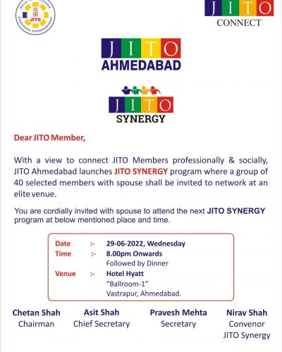 JITO Synergy was initiated under the leadership of Chairman Shri Chetan Shah and his team under the mission of Connect and Economic empowerment where a group of JITO members with spouse are invited to network and talk about their social, political and professional activities. 8 successful sessions are done and we welcome members to join us at the 9th JITO Synergy on 29th June 2022 at 8 pm at Hotel Hyatt with spouse to network and talk about social, political and professional activities.