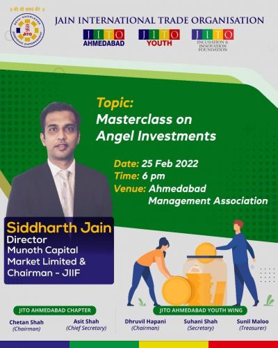 JITO Youth Wing along with JITO JIIF (Innovation & Incubation Foundation) cordially invites you for a Master class on Angel Investments with Mr. Siddharth Jain, Director of Munoth Capital & Chairman JIIF.