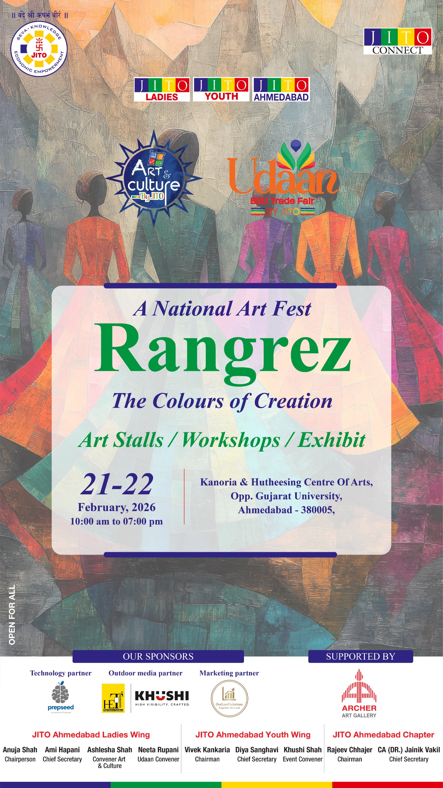 JITO Ladies Wing Ahmedabad warmly invites artists to participate in “Rangrez – A National Art Fest”, a grand celebration of creativity and culture.