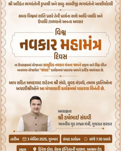 Additionally, the Honourable Home Minister has confirmed his participation in the Navkar Mahamantra Jaap program, which will be held at GMDC Ground on April 9, 2025. This event is expected to be a deeply significant occasion for the Jain community. The celebration aims to unite devotees and promote the Navkar Mahamantra as a global spiritual movement.