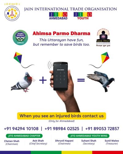 JITO Ahmedabad Youth Wing in association with Jinagnya Yuva Trust and Namo Namo Parivar is conducting a Save Birds Campaign to help and treat birds injured by our kite threads during Uttarayan.