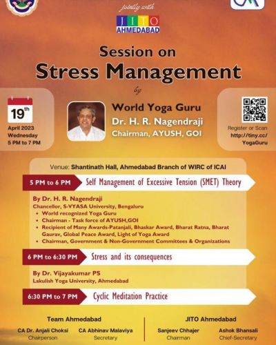 JITO Ahmedabad & Ahmedabad branch of WIRC of ICAI invite you to a session on Stress Management by Dr. H. R. Nagendraji on Wednesday, 19th April 2023.