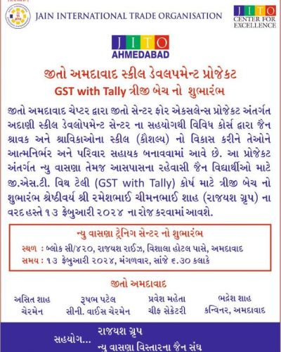 Skill Development Centre 3rd batch for GST with Tally to be launched by Shri Rameshbhai Chimanbhai Shah (Rajyash Group) on 13th February 2024 at 6.30 pm in association with Jain Sangh – Vasna