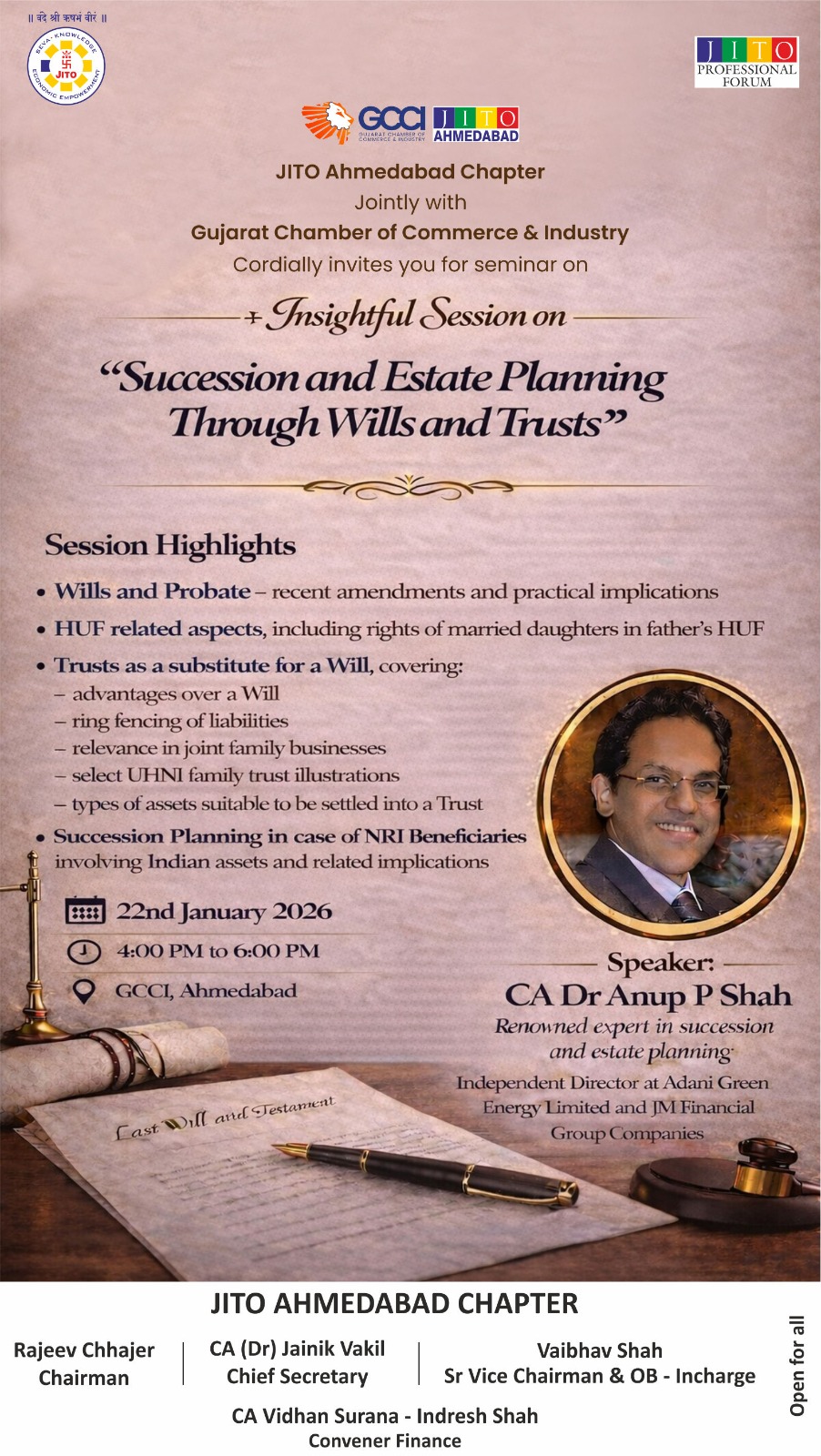 JITO Ahmedabad in association with GCCI cordially invites you for an insightful session on Succession Planning through wills & Trusts.