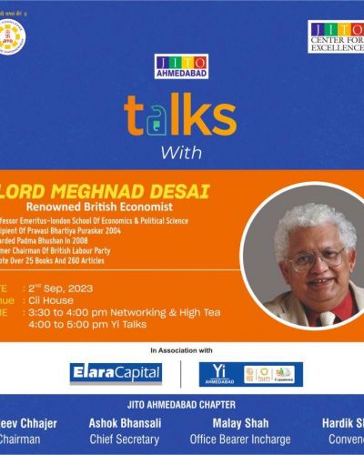 Join us for an insightful talks with renowned British Economist, Lord Meghnad Desai, hosted by JITO Ahmedabad in association with YI & Elara Capital, this event is a must-attend.