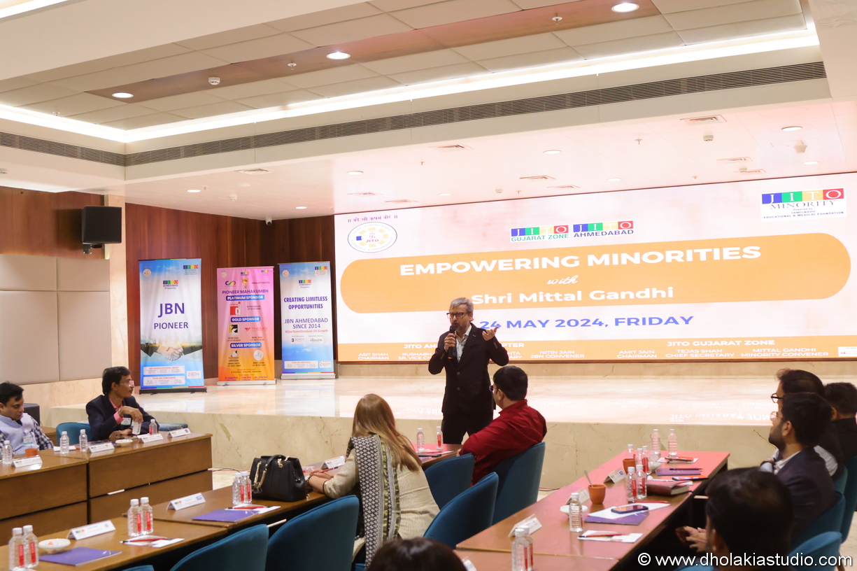 JITO Ahmedabad had the distinct honor of hosting an event ‘Empowering Minorities” on 24th May 2024, by the Minority Convener of the Gujarat Zone, Shri Mittal Gandhi. The focus was on the empowerment of minorities through various business benefit schemes provided by both the Central and State Governments.Shri Mittal Gandhi led the presentation with great insight and clarity. The event was met with an enthusiastic turnout, boasting an attendance of over 80 participants who were eager to learn and engage with the subject matter.The session shed light on numerous schemes designed to support minority communities in their business endeavors, emphasizing the importance of inclusive growth and equal opportunities. Gandhi’s presentation was both informative and inspiring, providing attendees with valuable knowledge to help them leverage these government initiatives effectively.Our heartfelt thanks extend to the Ahmedabad Chapter and the Gujarat Zone for their unwavering support and dedication to making this event a resounding success. Special appreciation goes to Shri Amit Jain, Shri Tejas Shah, Shri Asit Shah, and Shri Nitin Jain for their steadfast contributions and commitment to the cause.This meeting not only highlighted the significance of empowering minorities but also reinforced JITO’s mission to foster a thriving and inclusive business environment for all.
