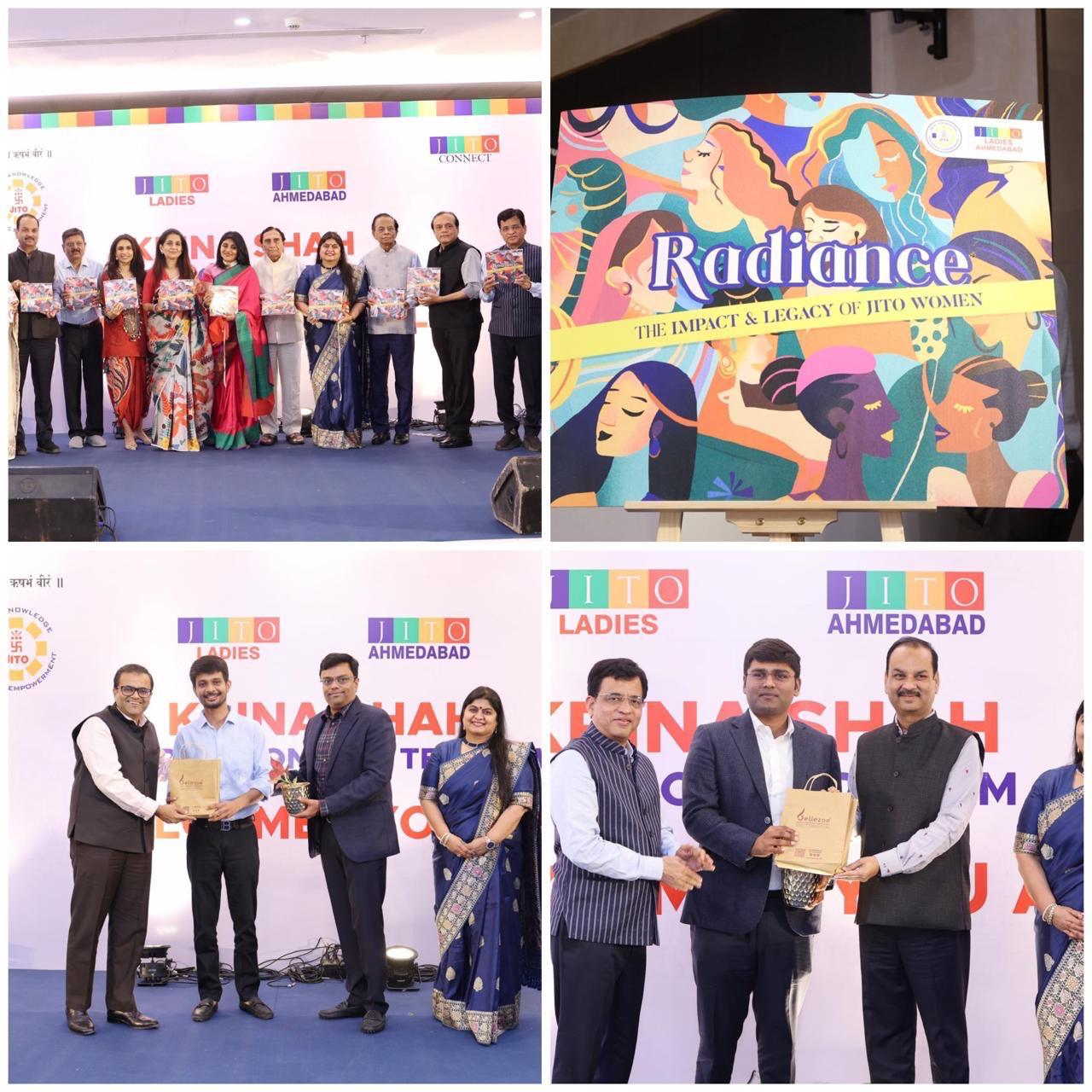 The Jito Ladies Wing (JLW) Ahmedabad held a memorable Gala Extravaganza on September 23, 2023, at the Kristar Banquet Hall. The event celebrated the achievements of its members and marked the culmination of a successful year. The dignitaries for this event were Padmashri Dr. Kumarpalji Desai, mayor Pratibhaji Jain, Jaina Lalbhai and Snehalben Nagar Seth.The evening began with a heartfelt felicitation of JLW members who have excelled in various fields, recognizing their remarkable contributions and successes. The Mayor Shrimati Pratibhaji Jain did the honour of felicitations with the Radiance awardsThe efforts of the core and executive committee members were also acknowledged, highlighting their dedication and hard work throughout the year. Past chairs of JLW were also acknowledged.A highlight of the event was the launch of a coffee table book titled “Radiance,” showcasing the Introduction of JITO, Aim of JITO Ladies Wing, ancient yet little known Derasars of Gujarat, Notable Jain Families & personality, the diverse events organized by Chairperson Krina Shah and the JLW team during the 2023-2024 term. This coffee table book serves as a testament to the creativity and dynamism of the organization.To add an element of fun, a drum circle was organized, allowing all 200 members present to engage in a lively and interactive experience, fostering camaraderie and joy.The evening concluded with a scrumptious spread of food, allowing members to enjoy a delightful dining experience. As the event drew to a close, many attendees took to the stage to express their gratitude and appreciation for Chairperson Krina Shah’s exemplary leadership and the splendid programs she initiated throughout the year. At the end the sponsors for the year were also acknowledged. They wereFibre to fashion, KB Zaveri, Signature Laminates, wonder Masala, Kirtiraj and Super city.Overall, the Gala Extravaganza not only celebrated achievements but also strengthened the bonds within the JLW community, leaving everyone with beautiful memories to cherish as the year came to a close.