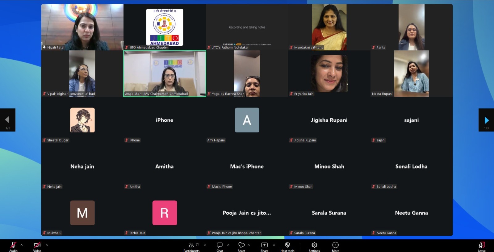 The JITO Ladies Wing Ahmedabad successfully conducted a 4-part online financial literacy series titled “Learn, Invest, Grow – Financial Independence for Women”, aimed at empowering women with practical financial knowledge and confidence.