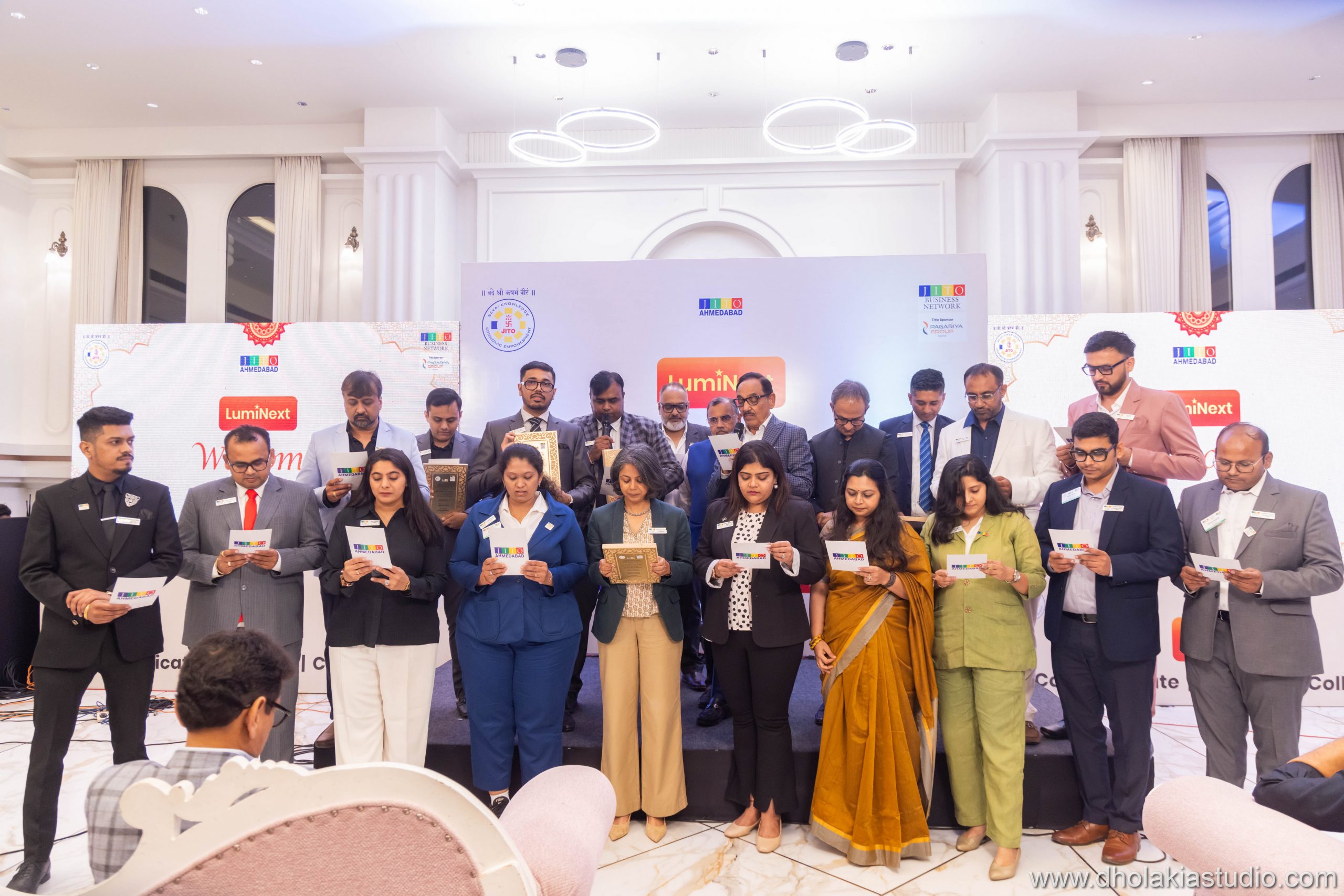Taking the stage, Mr. Rushabh Sanghvi unveiled his Leadership Headboard Team (Rushabh Sanghvi Convener, Dr. Swagat Shah- Co Convener, Rushit Shah- Co-Convener, Rachit Shah- Chief Secretary, Ruchita Shah- Treasurer) along with the Leadership Teams of all six Referral Groups (Pioneer, Dreamer, Visioner, Sapphire, Kohinoor & Solitaire), laying the foundation for a dynamic and collaborative future. He shared his vision and mission for the coming year, centered around the empowering tagline of the 3 C’s — Communicate, Connect and Collaborate.
