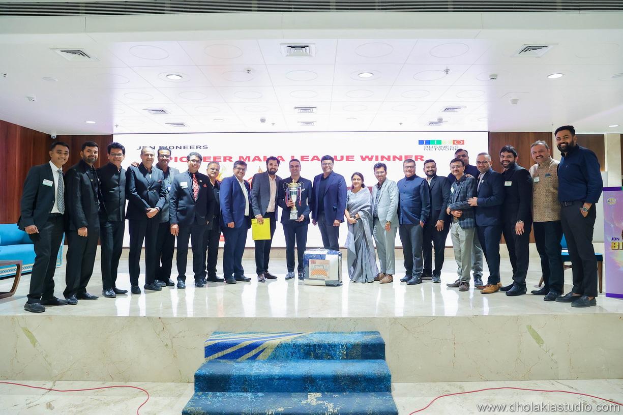 The Pioneer Chapter of JBN Ahmedabad recently marked the closing ceremony of its Pioneer Business League with an exhilarating event held on October 14, 2024, at the Grand Eulogia. The event featured a lively and engaging “Big Boss” theme that added a unique flair to the proceedings and kept the energy high among the attendees. The gathering witnessed participation from 84 members who came together to celebrate the success and camaraderie forged during the league.The highlight of the evening was the announcement of the winners. The Flowjet Wonders emerged as the champions, clinching the top spot with their outstanding performance throughout the league. The Sunrise Challengers secured the runners-up position, showcasing a commendable effort and determination. The competition for third place saw a tie between Kuber Fighters and Kaydee Risers, both teams displaying commendable skill and resilience.The event was a testament to the spirit of teamwork, competition, and community within the Pioneer Chapter. Congratulations to all the teams for their remarkable achievements and to the organizers for creating a memorable and successful event.