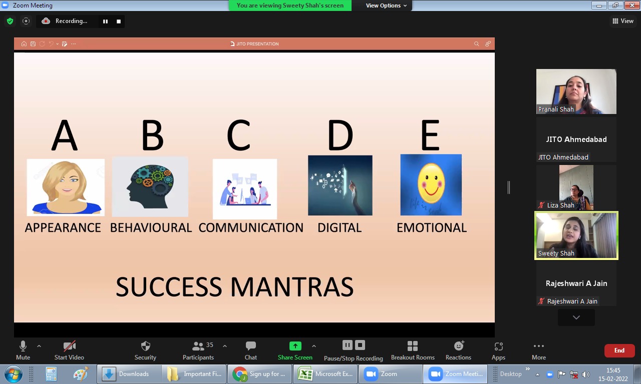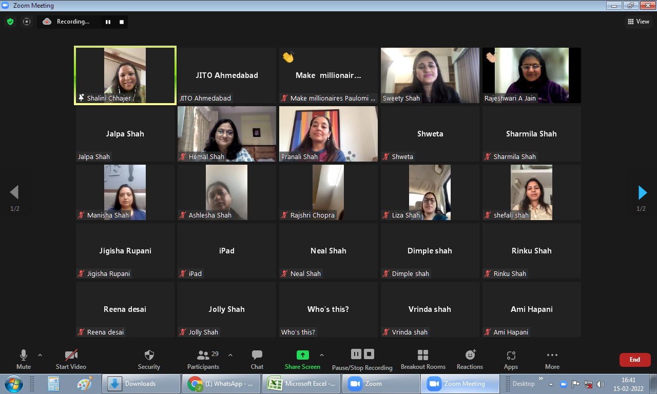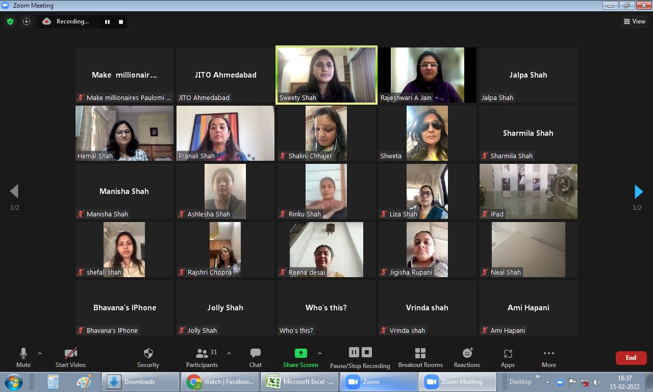 SWAG-Strong Women Achieving their Goals was successfully executed by Team JLW Ahmedabad under the verticalPehchaanon the 15thof February, 2022.Pehchaanmentor, MrsPranalienlightened about their vision and mission while Convener, MsHemalShah introduced the speakerSweetyShah.Sweetyenthralled her audience by throwing light on various aspects of personality and how one can enhance the same by recognising one’s own potential and highlighting the same.She drove home how one can refine their thought processes and thus fill their lives with positivity.Rajeshwarijicurated the session.In the end ,Mrs,ShaliniChajjerthe Co-Convener of TeamPehchaandelivered the vote of thanks.The events under the verticalPehchaanhave undoubtedly been a great success with such overwhelming attendance of 35+ members
