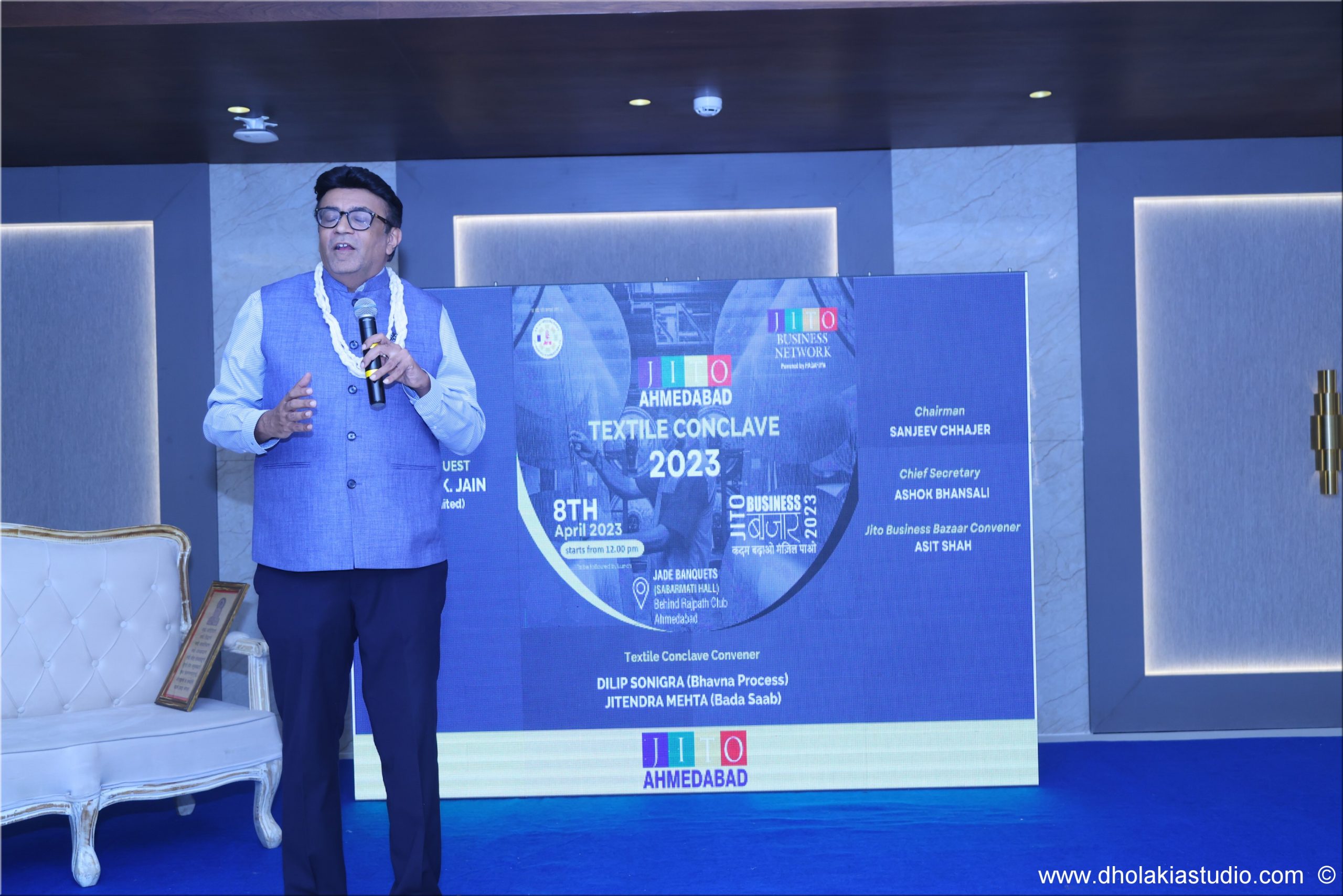 Textile Conclave [Convener, Shri Dilip Sonigra & Shri Jeethendar Mehta]Textile conclave was planned just before 2 days of JITO Business Bazaar event. Under the leadership of Shri Dilipbhai Sonigra and Shri Jeethendar ji Mehta, it was organized at Sabarmati Hall at Jade Banquet on 8thApril 2023. Many Jito members and non Jito members had attended the conclave.Chairman, Shraman Aarogyam Shri Prakashbhai Sanghvi of Ratnamani Group gave insights of JITO and its activities and benchmark projects.1.Crowd puller Shri Sanjay Jain of T. T. Ltd. And JBN Chairman from Kolkata was the Chief Guest at the conclave. He briefed the future of Textile industry and also gave insights of his success story.He focused on the challenges and opportunities facing the textile industry in India, and how Jain businessmen could contribute to its growth.The conclave also highlighted the importance of innovation and technology in the textile industry, and how Jain businessmen could leverage these to stay ahead of the competition.The conclave provided an opportunity for networking and collaboration among the participants, as well as a platform for sharing ideas and best practices.The event was well-received by the participants, who praised the organizers for putting together an informative and engaging program.50 members including JITO members and other Jain businessmen attended the conclave.