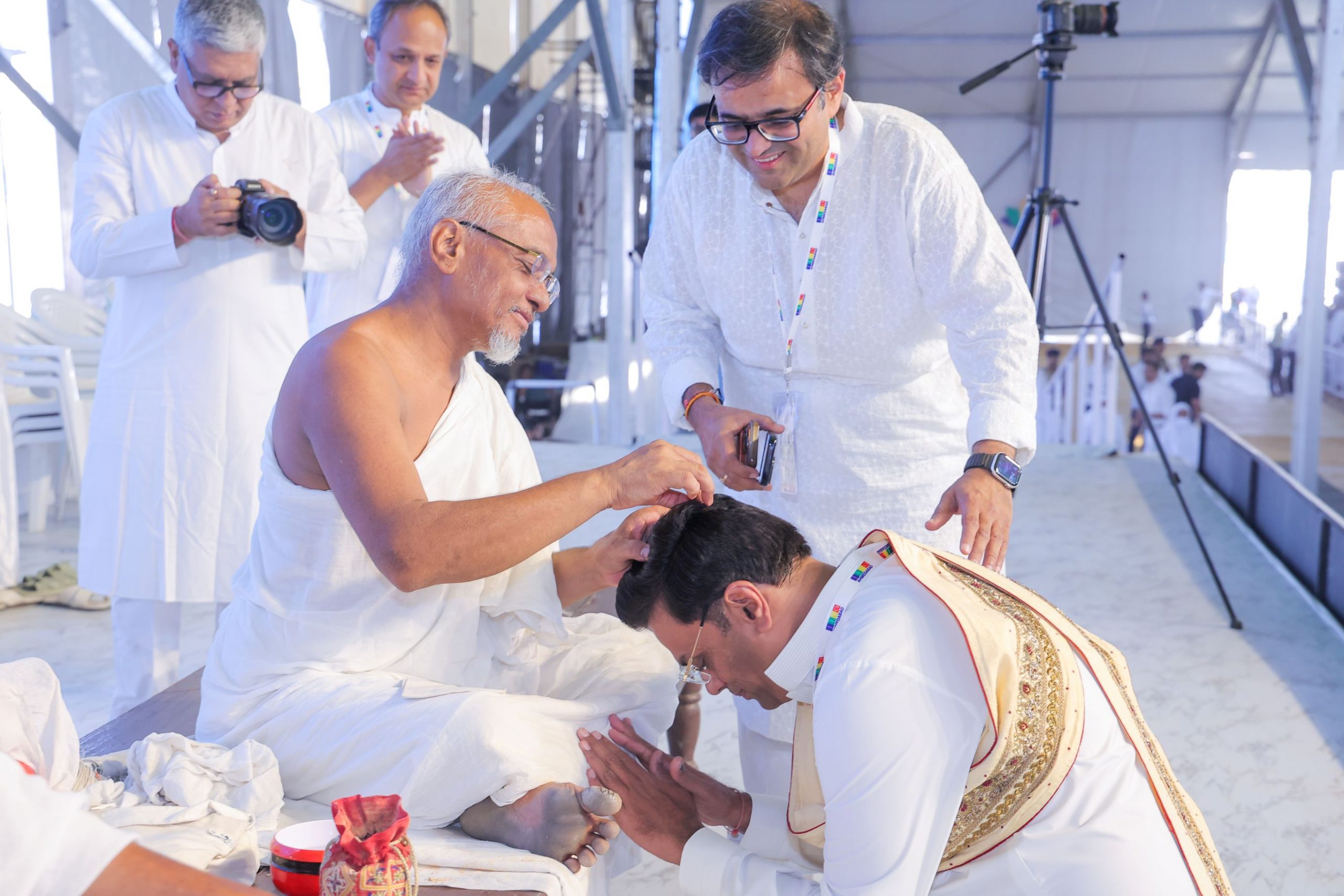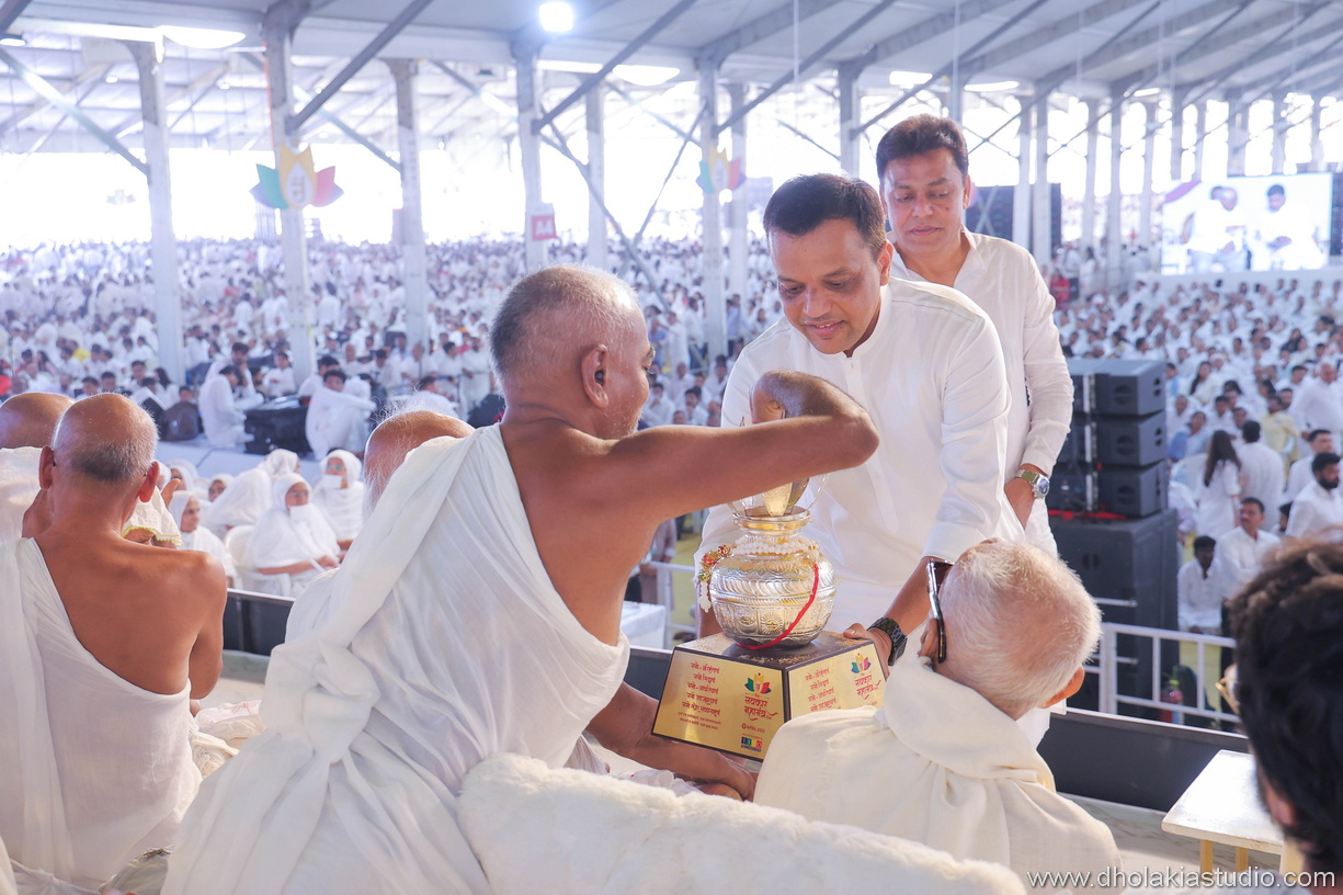 • Four hundred holy kalash, meticulously consecrated by Jain monks through the Vaskshep ritual, were distributed to the Sanghs representing all four Jain sects one month prior to the event. These venerated vessels became focal points of devotion, revered through mass chanting by devotees across communities. On 9th April, the kalash were ceremoniously displayed at the venue as a unifying spiritual centerpiece. During the proceedings, attendees chanted the Navkar Mantra in unison using specially distributed Navkarwali (mala). Following the event, the sanctified kalash were ritually returned to Sangh leaders, preserving their sacred significance for ongoing spiritual practices.